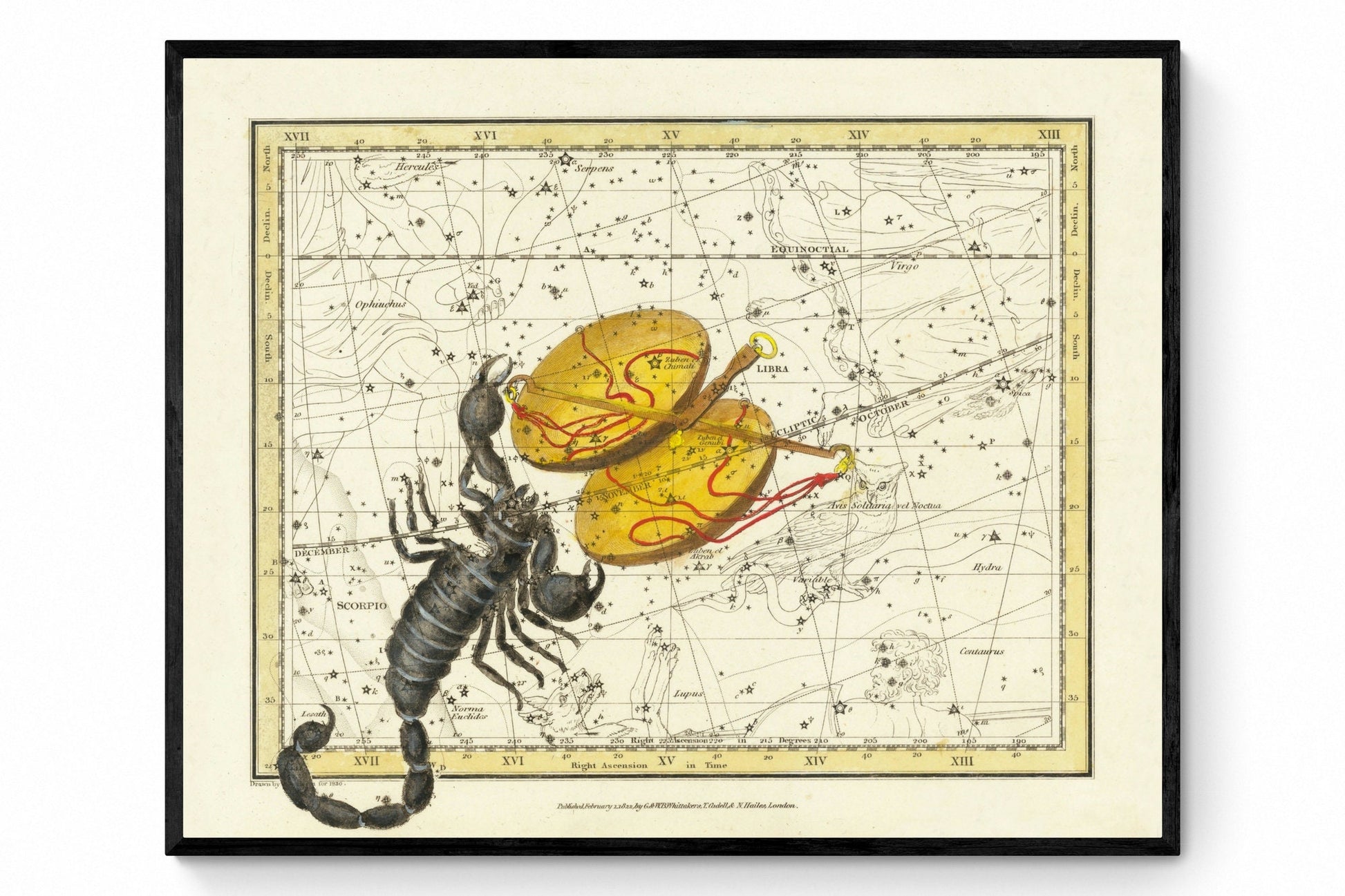 This vintage reproduction of Scorpio & Libra Constellations Antique Reproduction 1822 is a faithful representation of an original 19th-century engraving — perfect for classic interiors and collectors of antique-style wall art.