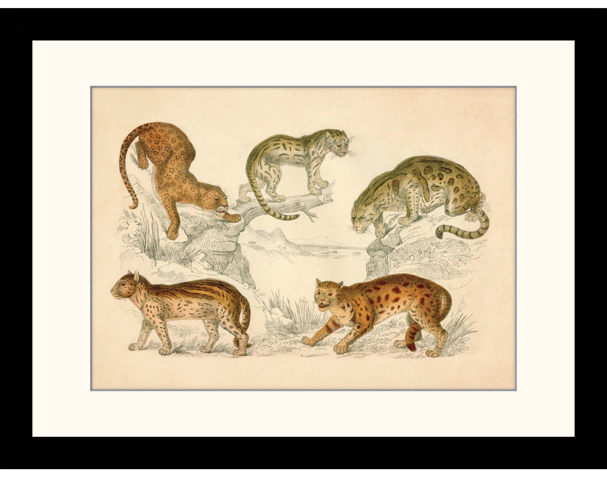 This vintage reproduction of Leopard, Neuwied Cat, Clouded Tiger, Ocelot And Sumatra Cat Print is a faithful representation of an original 19th-century engraving — perfect for classic interiors and collectors of antique-style wall art.