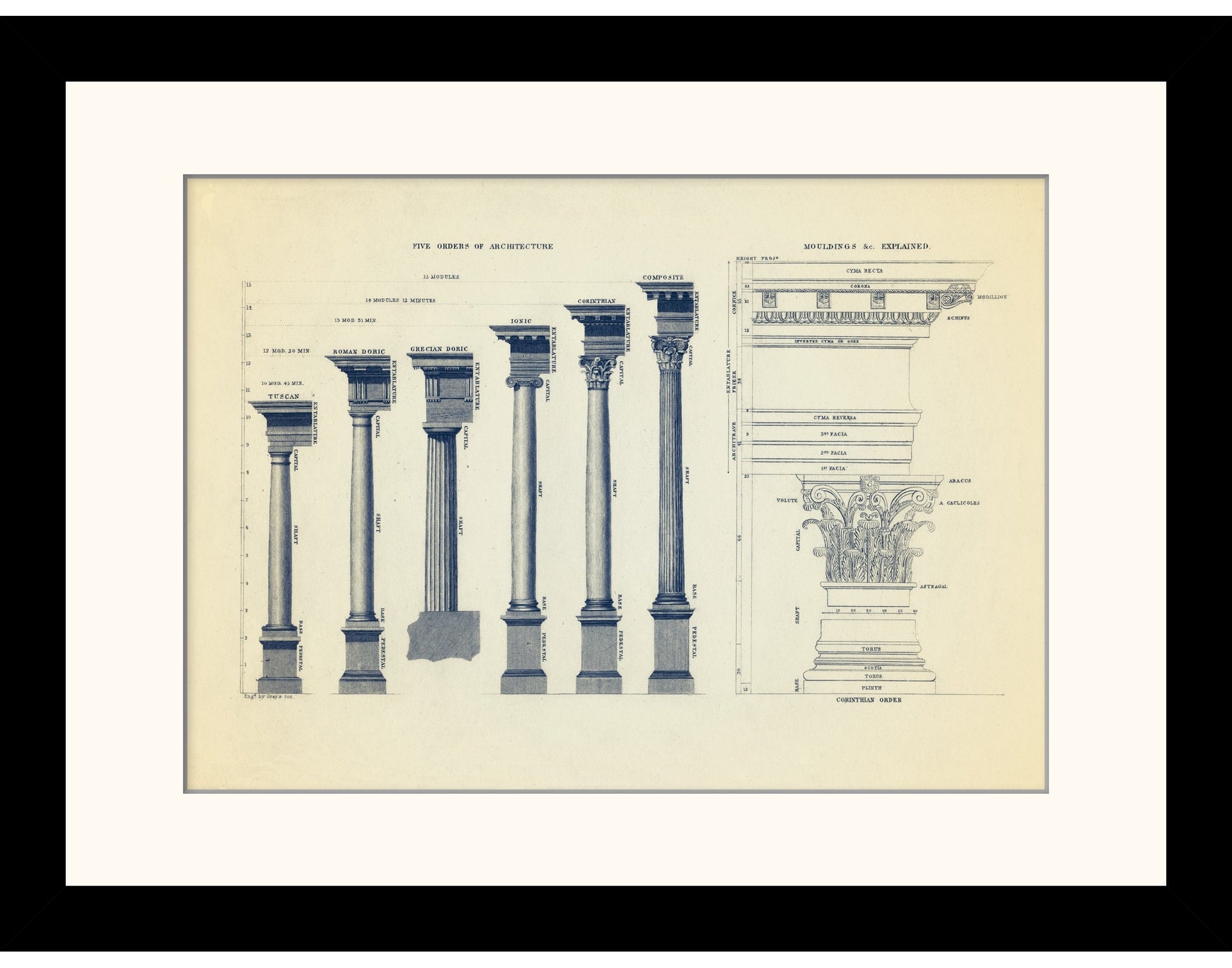 This architectural print of Orders Of Architecture And Architectural Mouldings Print is a restored reproduction of a Victorian-era engraving, celebrating classical design and antique artistry.